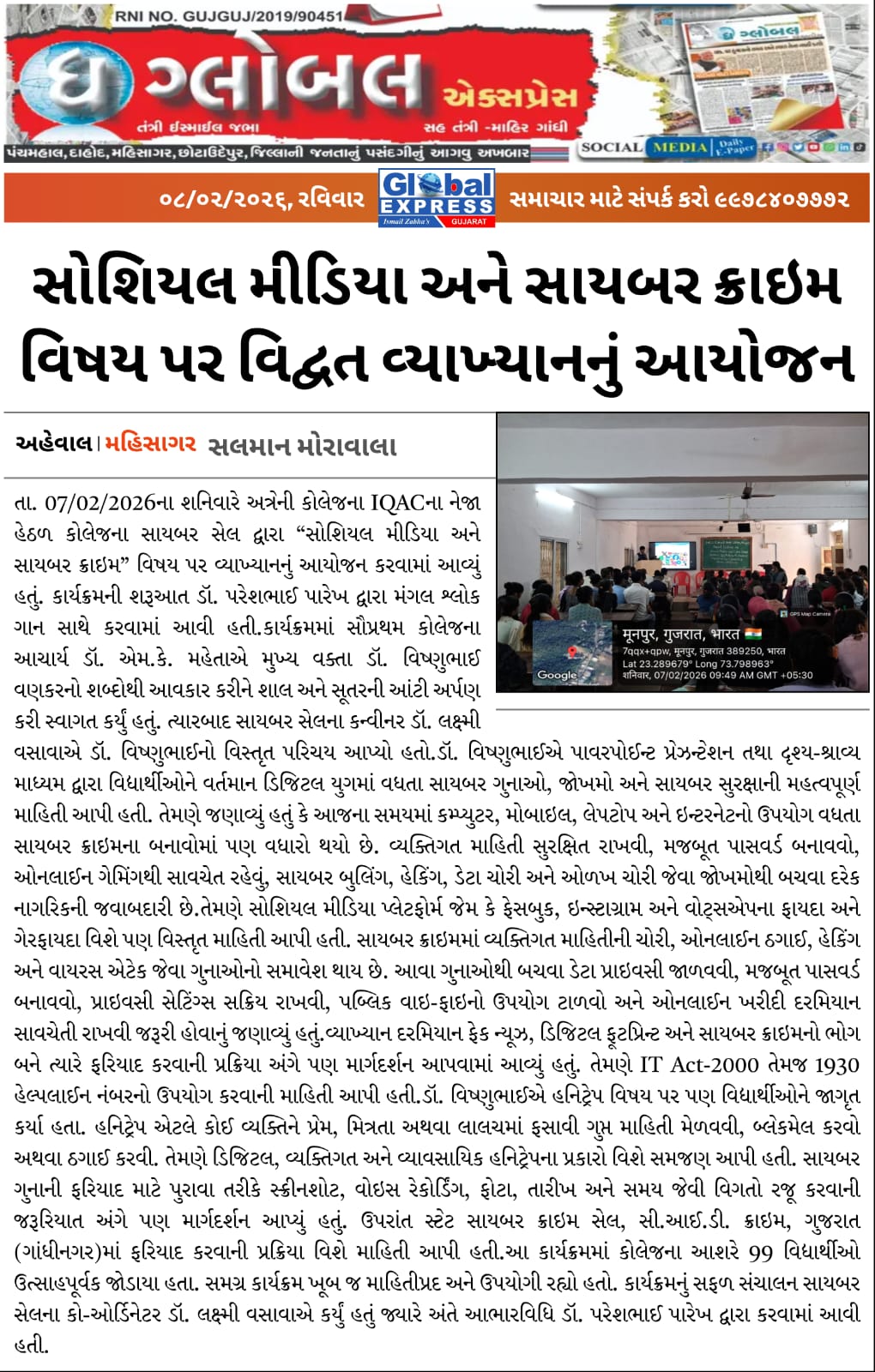 સોશિયલ મીડિયા અને સાયબર ક્રાઇમ વિષય પર વિદ્વત વ્યાખ્યાનનું આયોજન |