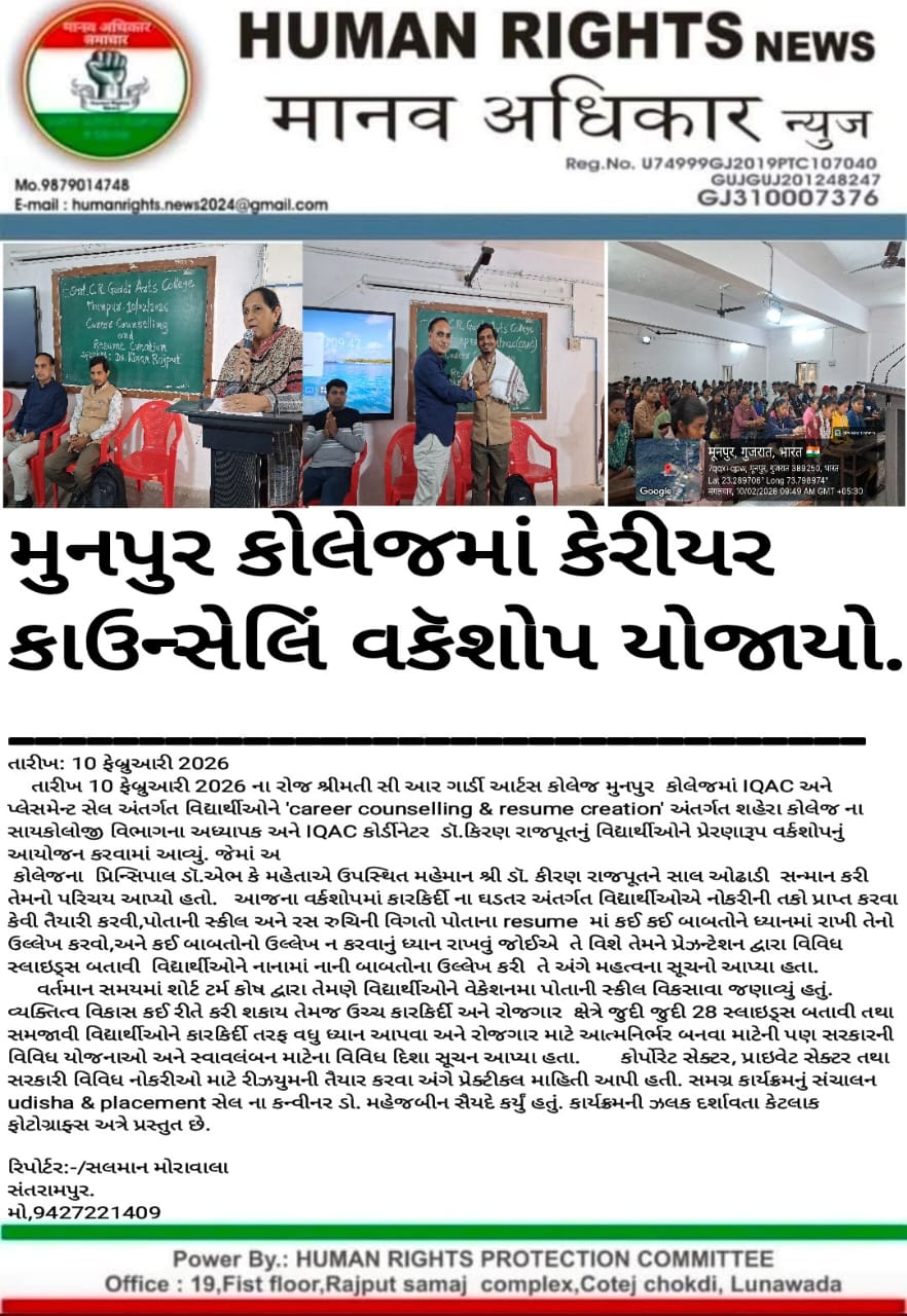 કરિઅર કાઉન્સેલિંગ અને પર્સનાલિટી ડેવલોપમેન્ટ વિષયક વ્યાખ્યાન : મધ્ય ગુજરાતનો અવાજ : 02-01-2025 |